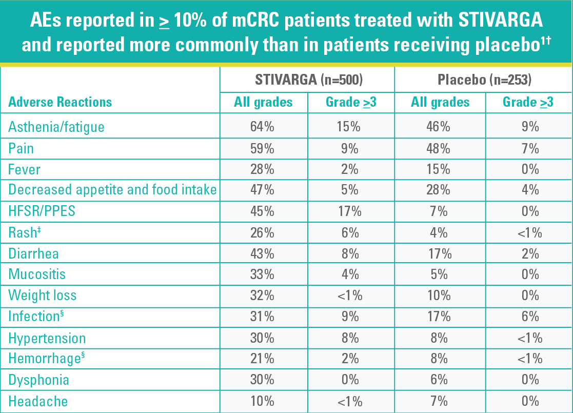 - 8.2% of STIVARGA patients discontinued treatment because of drug-related AEs vs 1.2% of placebo patients1